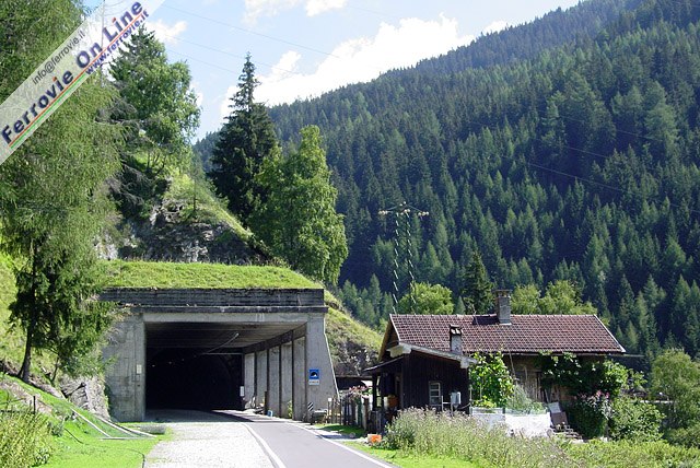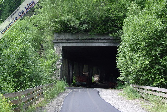 14. La galleria Ast (dal nome in tedesco della vicina frazione di Lasta, appartenente al Comune di Brennero) è posta sul tornante all'estremità Ovest del vecchio tracciato lungo la Val di Fleres. Nell'immagine l'imbocco a monte. La pista ciclabile non percorre la galleria in quanto lo sbocco a valle termina a ridosso dei binari della linea in esercizio. E' stato pertanto realizzato un percorso dedicato attraverso il bosco. (Foto Fabio Veronesi, 11 luglio 2010)