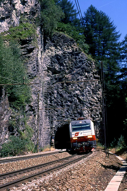 15. Dopo aver lasciato Colle Isarco e aver percorso la parte a valle della ferrovia lungo la Val di Fleres (tutt'ora in esercizio), la E.652.172 con il suo merci sbuca dalla galleria Ast e si dirige verso Moncucco e Brennero. (Foto Francesco Puppini, 1997)