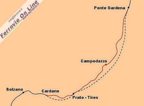 Il collegamento ciclabile tra Ponte Gardena e Bolzano, già attivo in molte tratte da alcuni anni e completato nel 2010, percorre quasi nella loro interezza le tratte ferroviarie dismesse nel settembre 1994 e nel luglio 1998 a seguito dell'apertura rispettivamente delle varianti "Sciliar" (lunghezza galleria 13.159 m) tra Ponte Gardena e Prato-Tires e "Cardano" (lunghezza galleria 3.789 m) tra Prato Tires e Bolzano. Un breve tratto nei pressi di Ponte Gardena e la parte terminale che si interconnette con la rete ciclabile urbana di Bolzano sono realizzati su preesistenti percorsi pedonali e stradali.