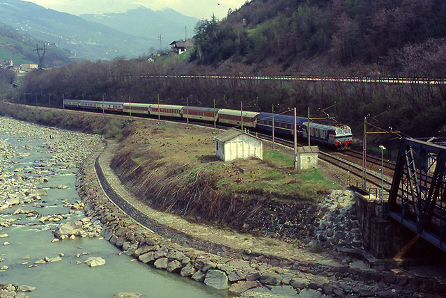 22. In questa immagine ripresa in direzione opposta rispetto alla precedente, un convoglio di ALe.840 e Le.640 viaggia verso il capoluogo altoatesino fiancheggiando il fiume Isarco. (Foto Franco Pepe, 17 aprile 1993)