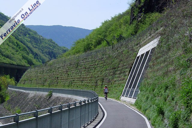 6. La galleria Ponticolo è la seconda e ultima che si incontra viaggiando verso Moncucco. E' sovrastata da un'estesa parete rocciosa a strapiombo sulla pista ciclabile che ha reso anche qui necessaria la copertura con reti di trattenuta per massi e frammenti di roccia. Rispetto all'immagine, attualmente la ciclabile è dotata di segnaletica verticale e orizzontale. (Foto Fabio Veronesi, 11 luglio 2010)