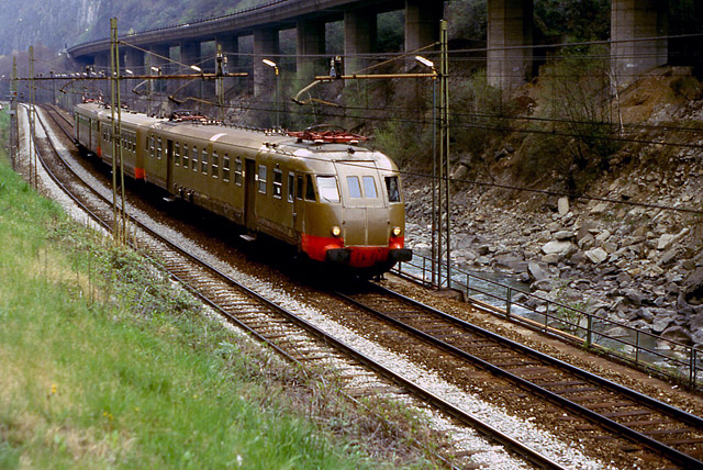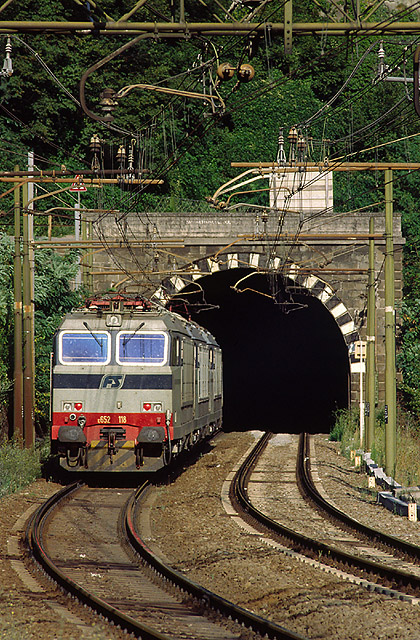 26. Tre E.652 di rimando verso Bolzano stanno per impegnare la stessa galleria dell'immagine precedente. Sopra la galleria transita la SS12 che ha qui mantenuto immutato il suo percorso. (Foto Francesco Puppini, 1994)