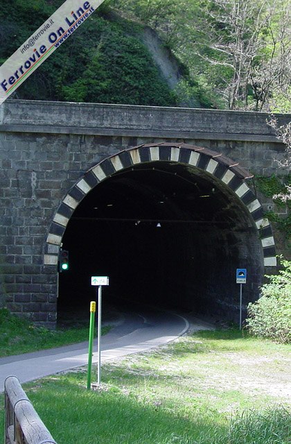 4. L'imbocco sud della stessa galleria presenta anche un tratto artificiale. L'interno è illuminato con un impianto dotato di fotocellule che ne comandano l'accensione solo al passaggio di pedoni e ciclisti. (Foto Fabio Veronesi, 17 agosto 2011)