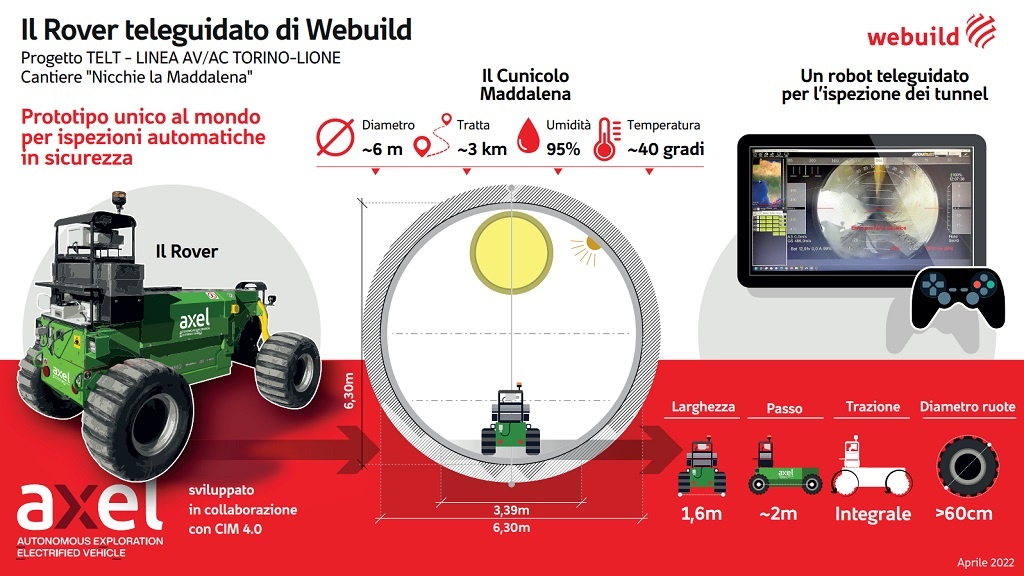 Webuild con CSC costruzioni (Gruppo Webuild) ha completato con successo la fase di test del prototipo AXEL (Autonomous Exploration Electrified Vehicle), tecnologia all'avanguardia destinata ad accrescere la sicurezza dei lavoratori impiegati in attività di tunnelling nella Torino - Lione. Si tratta di un sistema a guida remota altamente innovativo, il primo al mondo ad elevate prestazioni in grado di sostituire l'uomo nell'esplorazione di tratte di cunicoli e gallerie di cui non sono noti i rischi per la salute dei lavoratori. AXEL è frutto della collaborazione tra l'Ingegneria del Gruppo Webuild e i ricercatori del centro di eccellenza CIM (Competence Industry Manufacturing 4.0) e viene impiegato per sondaggi preliminari nei cunicoli delle nicchie di interscambio della galleria della Maddalena, nel cantiere Webuild attivo sul versante italiano del tunnel di base della Torino - Lione. Una applicazione innovativa della robotica alle infrastrutture, destinata ad accrescere la sicurezza sul lavoro per l'intera filiera.
