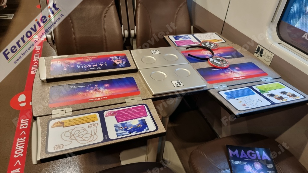 La magia inizia già in viaggio grazie a due carrozze del treno allestite internamente ed esternamente con i colori e le grafiche del 30° Anniversario di Disneyland Paris. Per i piccoli ospiti a bordo, sono presenti dei giochi dedicati stampati sui tavolini.