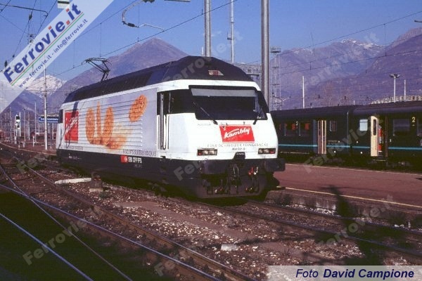 Arriva anche l'ora del nostro regionale che ci accompagna fino a Giubiasco; scendiamo dal treno, cambiamo marciapiede e mentre attendiamo l'ennesimo ed ultimo treno della giornata proveniente da Bellinzona che ci condurrà a Locarno, in lontananza scorgiamo un treno merci proveniente da Chiasso.