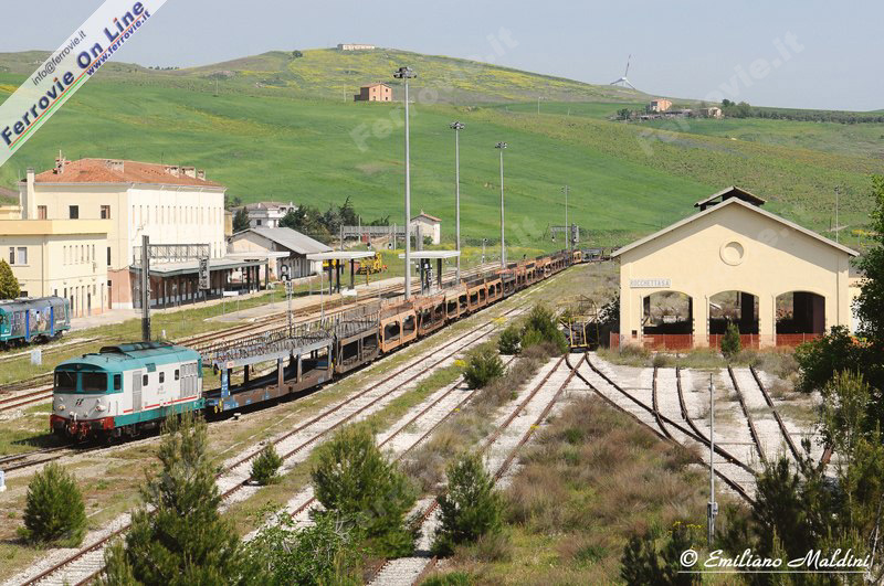 Il nostro viaggio inizia nella stazione di Rocchetta Sant'Antonio - Lacedonia, dove troviamo la D.443.1018 in testa ad un treno di carri porta auto vuoti, proveniente da Foggia e diretto a San Nicola di Melfi. (Foto Emiliano Maldini, 22 aprile 2011)