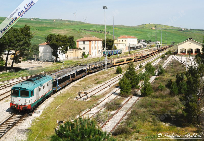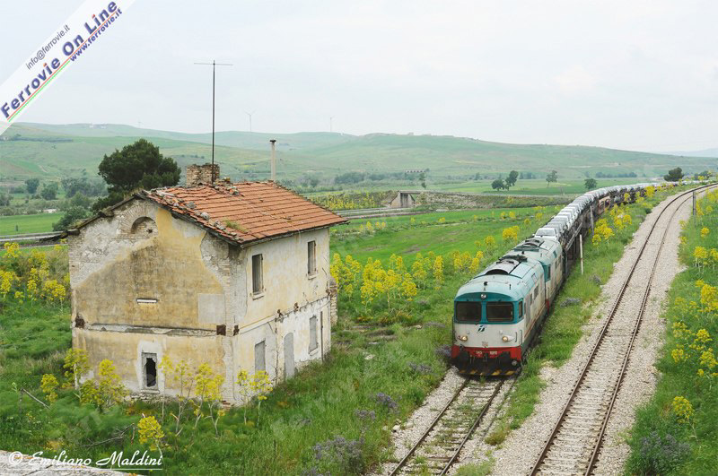 Una doppia trazione di locomotive Diesel D.345, con in testa l'unità .1080, in arrivo da San Nicola di Melfi, con un treno carico di automobili FIAT, diretto a Foggia. Sulla destra il binario della linea per Potenza, che sale con una pendenza del 28 per mille. (Foto Emiliano Maldini, 28 aprile 2011)
