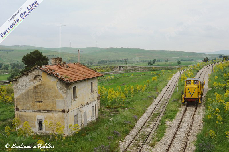 Nel mese di aprile e maggio 2011, a causa di una frana, la linea Foggia - Potenza è stata interrotta tra le stazioni di Rocchetta S.Antonio e Leonessa, per permettere l'esecuzione di lavori di risanamento del tratto in questione alcuni treni cantiere facevano la spola tra le due località. In fotografia vediamo una locomotiva Diesel V 60 ex DB con un carro pianale, in arrivo a Rocchetta S.Antonio. (Foto Emiliano Maldini, 28 aprile 2011)