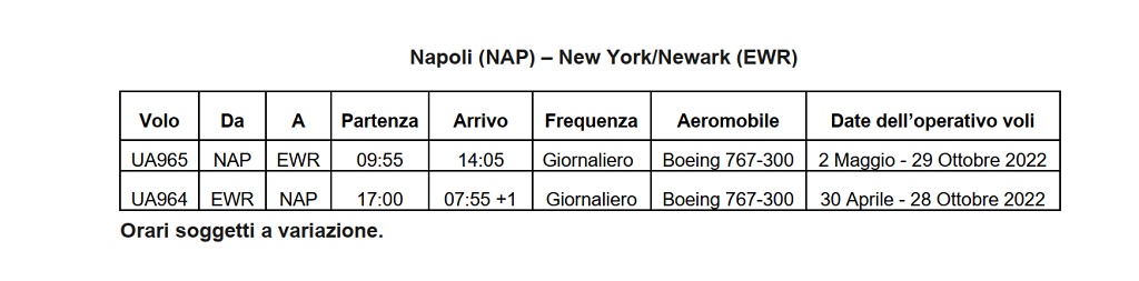 United Airlines ripristina il collegamento diretto giornaliero Napoli - New York/Newark con il primo volo partito il 2 maggio dall'aeroporto di Napoli. Il collegamento sarà operativo fino al 29 ottobre 2022 e si aggiunge ai diretti giornalieri, operati tutto l'anno, da Roma e Milano Malpensa verso l'hub della compagnia aerea di New York/Newark e al collegamento stagionale da Roma all'hub di Washington Dulles.