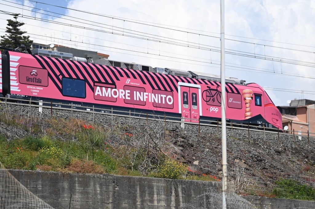 Da Catania a Fiumefreddo, su un treno regionale Pop di Trenitalia (Gruppo FS Italiane). Il Trofeo Senza Fine, che sarà consegnato al vincitore del Giro d'Italia 2022, ha viaggiato oggi in Sicilia su un convoglio con una livrea rosa in onore della più prestigiosa gara ciclistica italiana.
