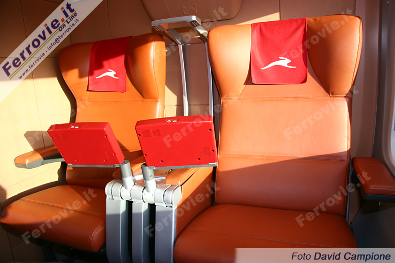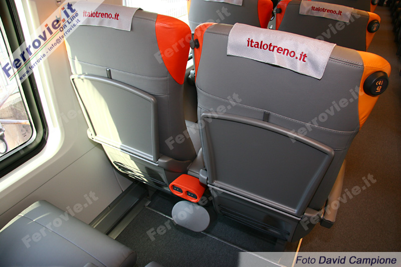 In posizione ben visibile e comode per l'uso le prese di corrente, incorporate nel sedile anteriore, anche se c'è il rischio di danneggiare una eventuale spina inserita qualora si muovessero distrattamente le gambe visto lo spazio non proprio abbondante rispetto alla fila antistante. In Smart si nota la mancanza delle comode tasche porta oggetti tra le due poltrone, presenti in Prima e Prima Relax; sullo schienale davanti è comunque disponibile una tasca per bottiglie e libri o riviste con elastico. Anche nella classe inferiore le poltrone sono in pelle, con schienali reclinabili.
