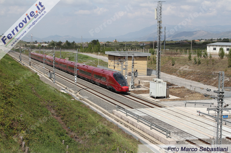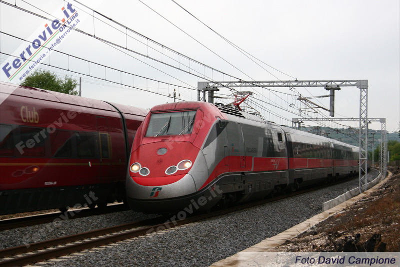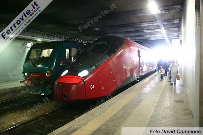 Condividiamo il nostro marciapiede con un Frecciarossa diretto a Salerno e la situazione consente un raffronto in termini di rumorosità tra i due treni fermi e abilitati, in prossimità del paraurti. Ne esce naturalmente sconfitto l'ETR.500, che essendo a dispetto del nome "elettrotreno" un treno tradizionale formato da due locomotive E.404 con intercalate undici carrozze, concentra la trazione alle due estremità dove si localizza tutto il rumore derivante dalle apparecchiature di raffreddamento della componentistica elettronica. Pressochè nullo il rumore derivante dall'AGV 575, come del resto accade per gli ETR.485/600/610 di Trenitalia e simili.