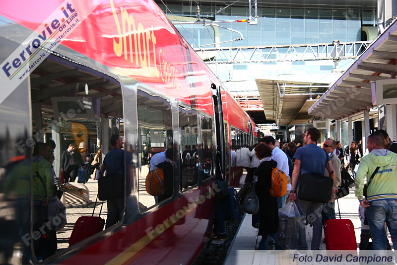Folla delle grandi occasioni sul marciapiede, con pochi passeggeri che scendono da Italo e molti di più che salgono: ancora turisti stranieri, tanti giovani e soprattutto famiglie con bambini che indossano la maglietta rossa, omaggio di NTV per celebrare questo viaggio.