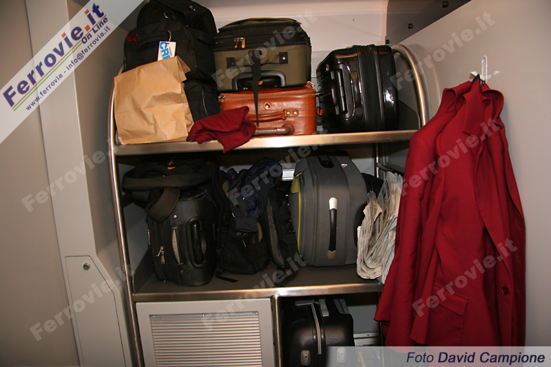 In ordine i numerosi bagagli dei viaggiatori presenti sul treno: sono disponibili cappelliere sui posti a sedere, bagagliere alle estremità del salone ed altre ancora nel vestibolo, quest'ultime con videosorveglianza; in Prima e Club alcune bagagliere sono anche dotate di apposito sistema antifurto. La disposizione a correre dei sedili non lascia molto spazio a trolley e simili sul pavimento in prossimità del viaggiatore, al contrario dell'ETR.500 che tra due poltrone spalla a spalla dispongono di spazio in terra per una valigia media.