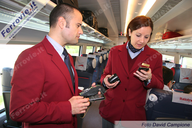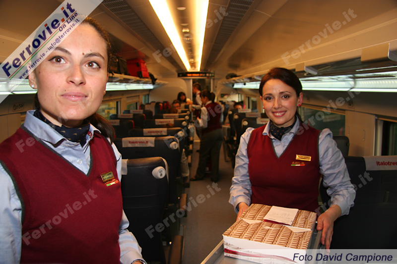 In condizioni di esercizio normale, l'equipaggio di Italo si compone di un macchinista, un train manager, un train specialist e tre o quattro tra hostess e steward. Il train manager, corrispondente alla figura del capotreno di Trenitalia, sovraintende il personale di bordo (eccetto il macchinista) ed i viaggiatori. Oggi è un giorno speciale e il personale NTV qui presente è ben più numeroso, senza contare istruttori, tecnici e dirigenti di NTV come di Alstom che presenziano il convoglio in gran forza.