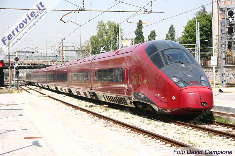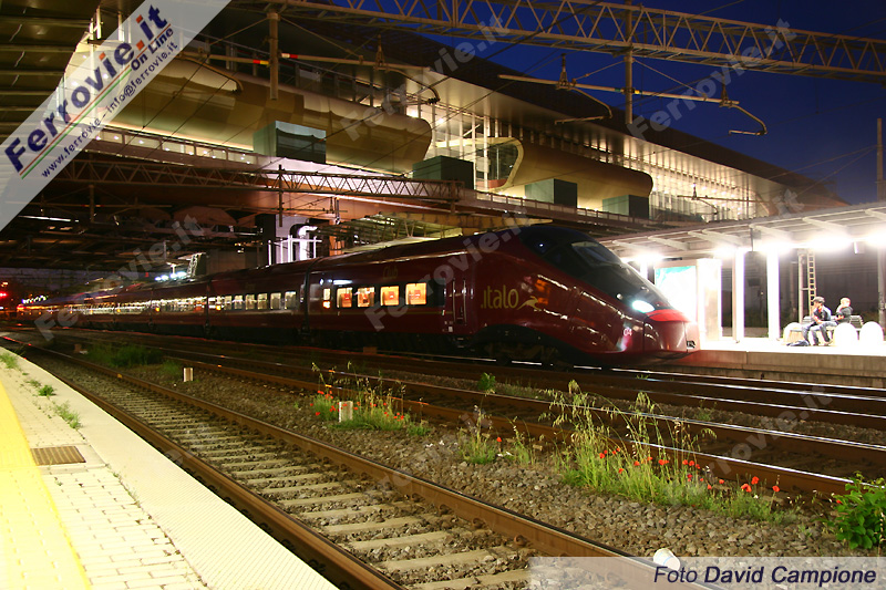Puntuale alle 7 l'AGV 575 n.4 muove verso Roma; immediatamente un annuncio sonoro dà il benvenuto ai viaggiatori in italiano ed inglese, mentre sfiliamo lentamente accanto ad un altro Italo, pronto quale riserva calda del nostro treno ed in sosta sui binari di scalo riservati a NTV.