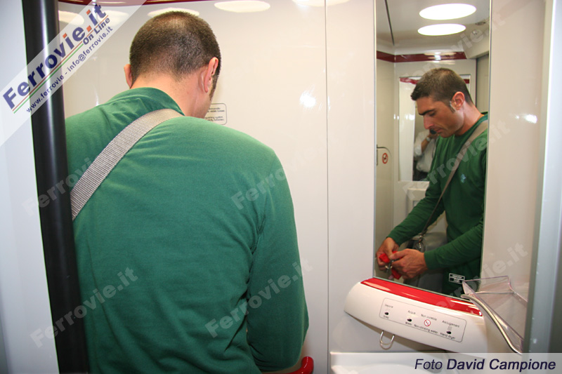 Il pulitore di bordo, presente su tutti i treni NTV, continua il suo maniacale lavoro di lucidatura dei già pulitissimi bagni. Nulla da eccepire sulle ritirate, ma a voler trovare il pelo nell'uovo si potrebbe lamentare la presenza all'esterno delle ritirate di un piccolo gradino dovuto allo stesso dislivello riscontrato in vettura e precedentemente menzionato, che se non visto potrebbe causare l'inciampo.