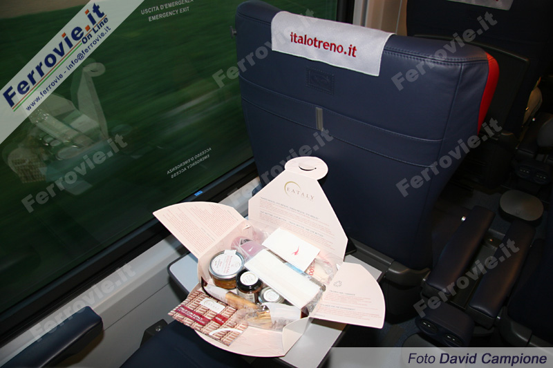 A bordo le hostess servono il welcome drink al posto, con carrellino nella Prima e vassoio (dopo aver preso l'ordinazione) nella Club: un quotidiano a scelta tra i principali nazionali, una bevanda calda o fredda, uno snack dolce o salato confezionato. Intanto train manager e train specialist effettuano la controlleria: i passeggeri sono muniti di biglietti cartacei emessi dalle biglietterie self service di stazione di formato simile a quello in uso presso Trenitalia, di biglietto cartaceo su A4 acquistato su internet dal sito www.italotreno.it piuttosto che in agenzia viaggi o ancora di sms con codice univoco da comunicare a voce.