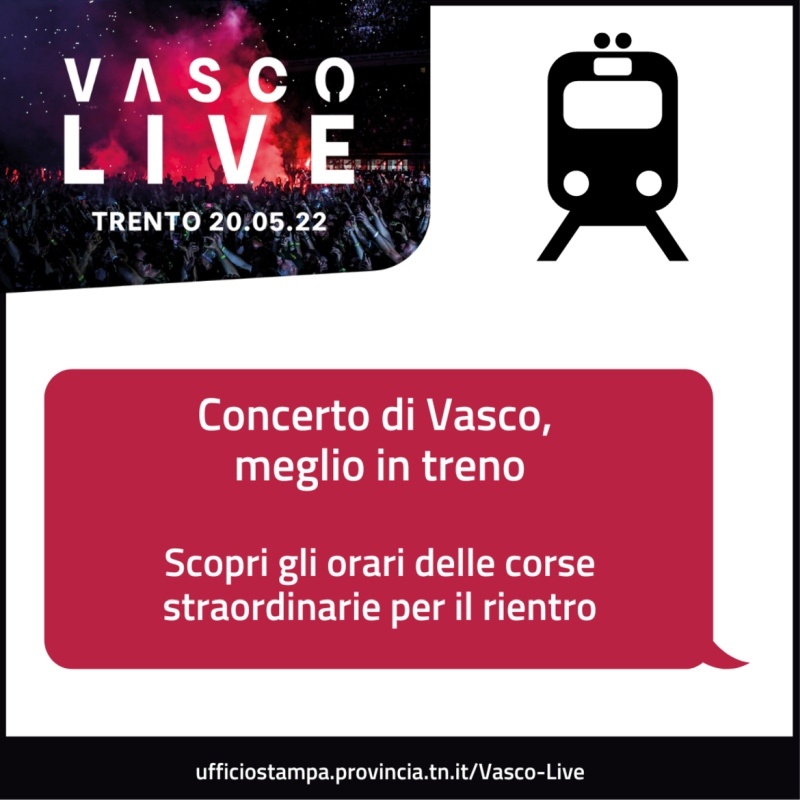 È ampia l'offerta messa in campo per la mobilità in occasione dell'inaugurazione della Trentino Music Arena in programma venerdì 20 maggio 2022 con il concerto di Vasco Rossi. Il Dipartimento territorio e trasporti, ambiente, energia e cooperazione della Provincia autonoma di Trento, in coordinamento con Trenitalia, fa presente che per raggiungere Trento gli orari rimangono invariati, considerando che si prevede un afflusso graduale. Come già spiegato, per favorire un rientro il più ordinato possibile di una presenza così importante di spettatori sono stati istituiti dei treni straordinari lungo la linea del Brennero, la linea Trento - Bassano e sulla ferrovia Trento - Malé - Mezzana.