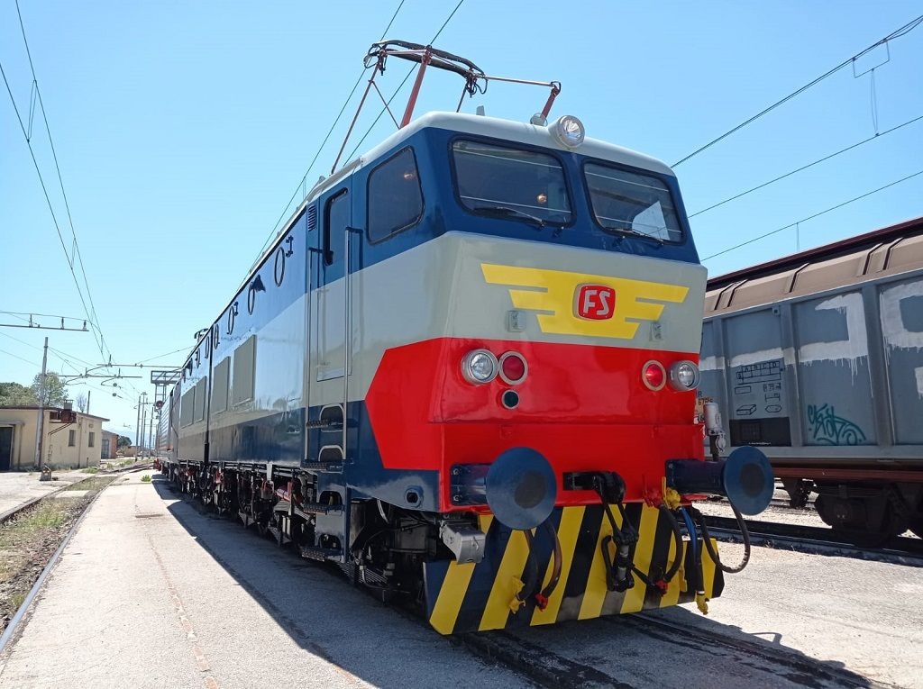 Prima corsa prova tra Foligno e Spoleto per la E.656.492, ancora in livrea incompleta. La locomotiva è stata interessata da revisione di tipo Cc e un totale riordino delle apparecchiature elettriche e meccaniche con risanamento completo della cassa.