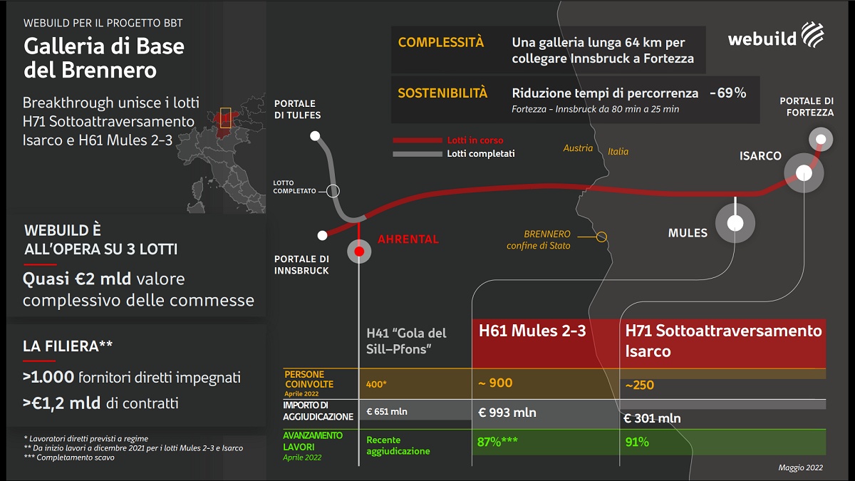 Webuild ad oggi è su 4 lotti della Galleria di Base del Brennero, di cui 3 in costruzione e 1 già ultimato - più di ogni altra impresa coinvolta nel progetto complessivo. In aggiunta ai due lotti sul versante italiano interessati dal breakthrough del 19 maggio, Webuild sta anche lavorando al lotto H41 Gola del Sill - Pfons e ha già completato il lotto Tulfes - Pfons, entrambi sul versante austriaco. Per i tre lotti in costruzione, è previsto l'impiego di circa 1.600 lavoratori e il coinvolgimento di una filiera che, solo per i lotti H71 e H61 sul versante italiano, si compone di circa 1.000 fornitori diretti, quasi tutti locali. In aggiunta, Webuild è impegnato anche nella realizzazione delle tratte d'accesso sud alla Galleria di Base del Brennero, tra Fortezza e Ponte Gardena. Nelle tratte di competenza di Webuild, l'attraversamento delle Alpi è reso particolarmente sfidante dal fatto che il tracciato attraversa la Linea Periadriatica, la più lunga zona di faglia dell'intero arco alpino.