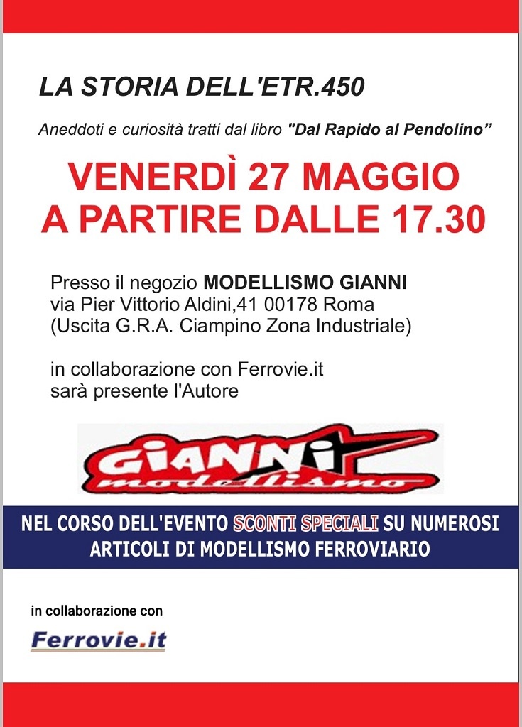 Venerdì 27 maggio a partire dalle 17.30, presso il negozio Modellismo Gianni di Roma, aneddoti e curiosità tratti dal libro "Dal Rapido al Pendolino". Interverrà l'autore Alessandro Vacca.