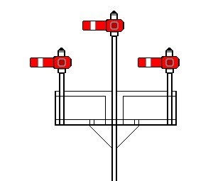 Nei due esempi qui riportati, abbiamo a sinistra un candeliere indicante via impedita per tutti e tre gli itinerari. In quello di destra, via libera per l'itinerario di sx, da percorrere a 30 km/h fino a quando il treno non ha superato i deviatoi in uscita.