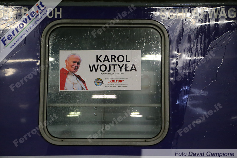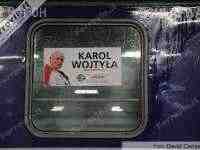 L'effige di Karol Wojtyla presente sui pullman così come sui finestrini dei treni PKP, a rimarcare il legame tra i polacchi ed il loro Papa. (Foto David Campione, 27 aprile 2014)