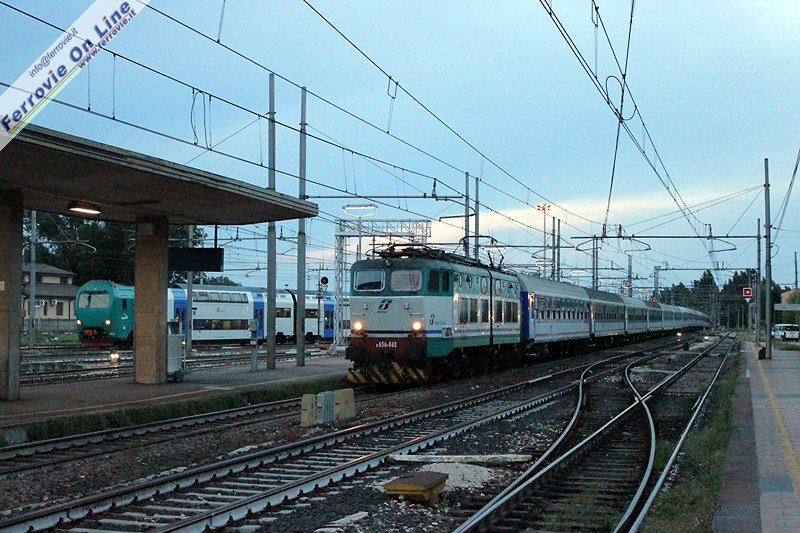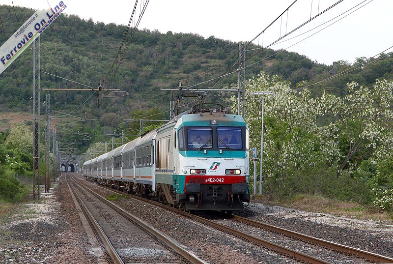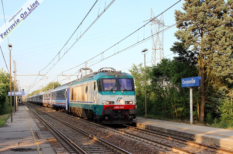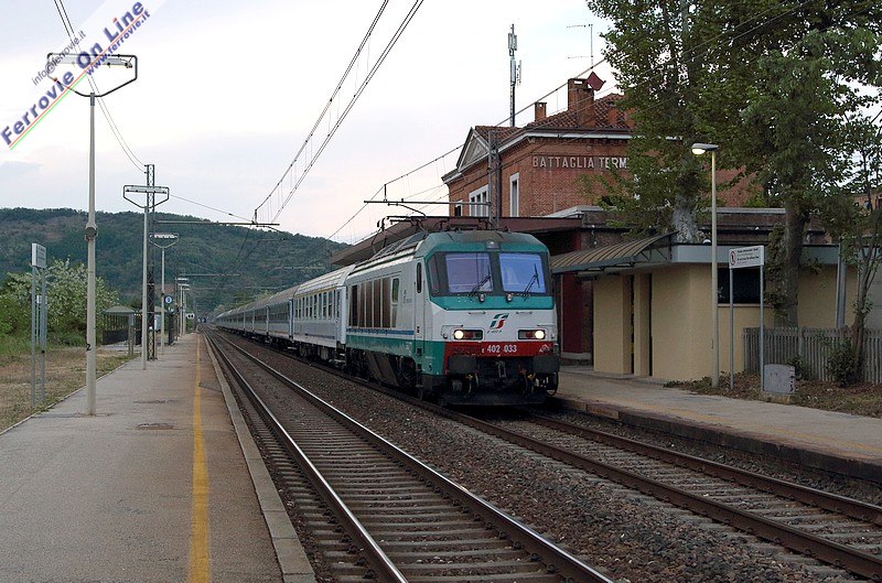 Treno 14323 in transito a Battaglia Terme, in testa l'E.402.033. (Foto Fabrizio Montignani, 26 aprile 2014)