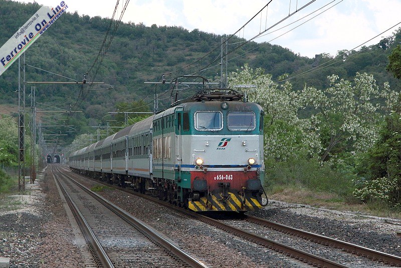 Circa un'ora dopo è il turno del treno 14315, in corsa nei pressi di Battaglia Terme sullo sfondo della galleria del Cataio, l'unica della linea Padova-Bologna. In testa l'E.656.063. (Foto Fabrizio Montignani, 26 aprile 2014)