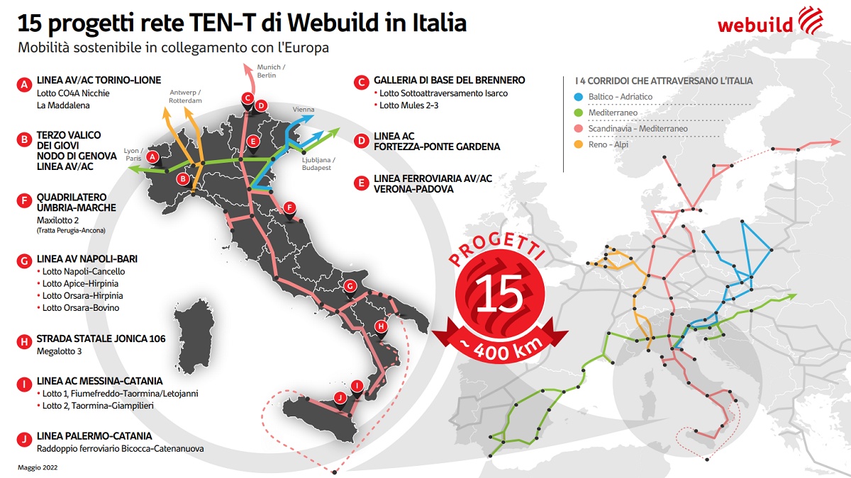 Webuild vanta un track record che include la costruzione di oltre 13.600 km di metropolitane e linee ferroviarie, più di 80.200 km di strade, 946 km di ponti e viadotti e oltre 2.300 km di gallerie e opere sotterranee. I progetti più recenti includono linee ferroviarie ad alta velocità/alta capacità per migliorare i collegamenti dell'Italia, tra cui il Terzo Valico dei Giovi - Nodo di Genova che potenzierà i collegamenti tra il porto di Genova e il resto d'Europa, la linea ferroviaria ad alta velocità e alta capacità Verona - Padova, diversi lotti della linea ad alta velocità Napoli - Bari, e la linea ad alta capacità Palermo - Catania. Nel complesso, il Gruppo Webuild sta realizzando 15 progetti che sono parte della rete ferroviaria europea TEN-T: circa 400 km di linee ferroviarie e strade che uniscono cinque corridoi in tutta Europa.