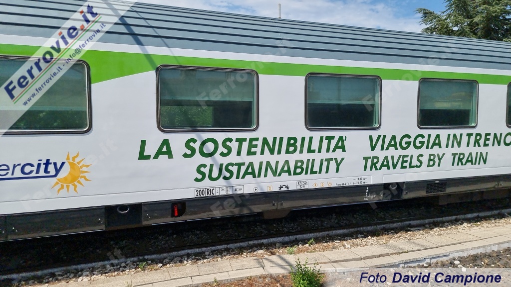 VERONA - "La sostenibilità viaggia in treno''. È questo lo slogan che contraddistingue, insieme al colore verde, la nuova livrea applicata su un convoglio Intercity di Trenitalia composto dalle due locomotive elettriche E.414.115 e 135 e otto carrozze IC270 e IC901 (due prime classi e sei seconde di cui una speciale).