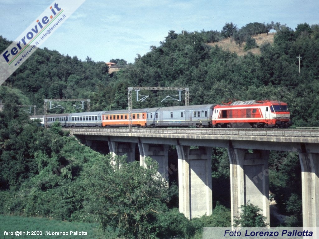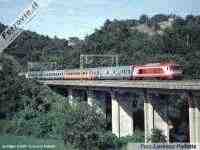 In una calda giornata estiva, un treno Intercity proveniente da Milano e trainato da una E.402 percorre ad alta velocità gli ultimi chilometri della Direttissima Firenze - Roma nei pressi di Castelnuovo di Porto, prima di raggiungere la Capitale. (Foto Lorenzo Pallotta, 23 luglio 1999)