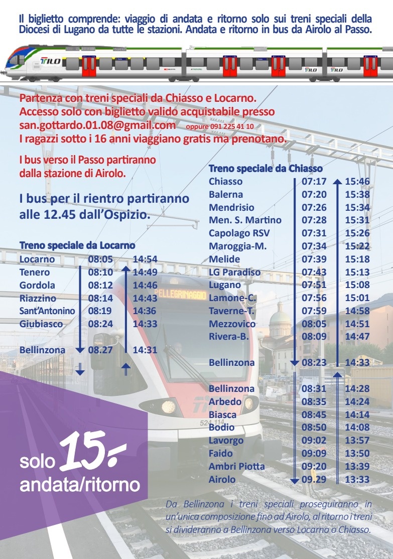 Grazie alla felice collaborazione di alcuni preti appassionati di ferrovia con TiLo SA, SBB CFF FFS e Marchetti SA, sarà possibile raggiungere il Passo da ogni stazione del Cantone Ticino grazie ai treni speciali organizzati appositamente. Per accedere ai treni speciali è necessario avere il biglietto valido (sotto i 16 anni gratuito, per adulti 15.- A/R) acquistabile presso le parrocchie.