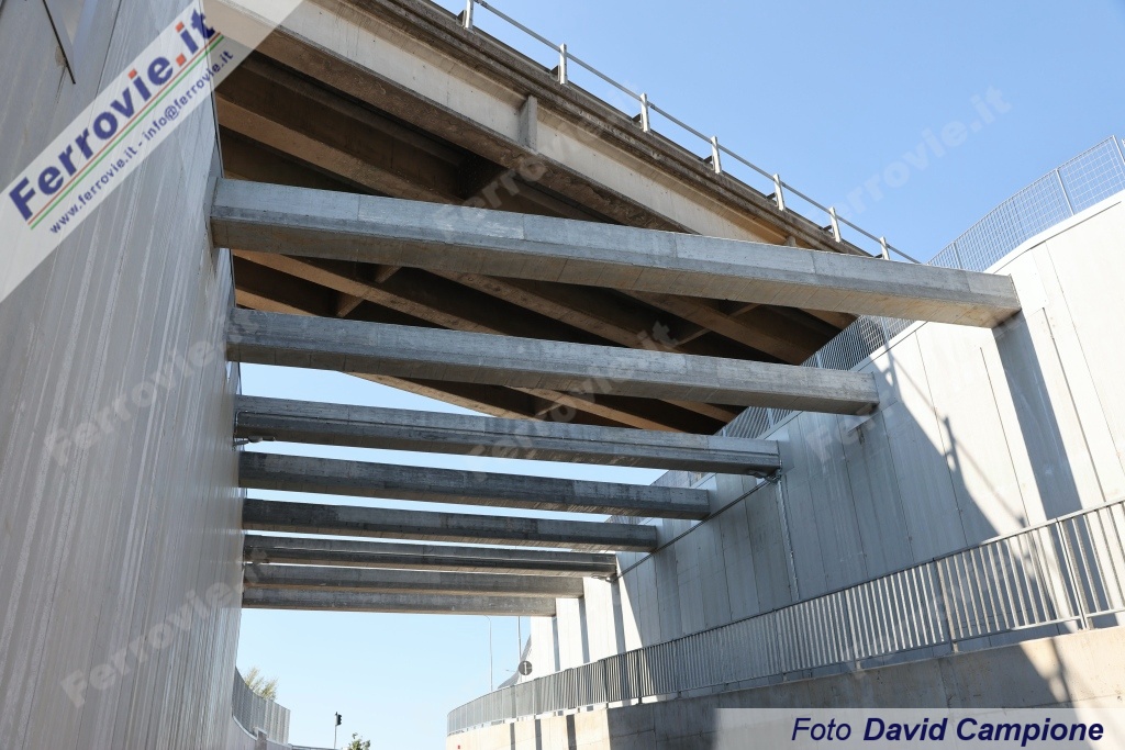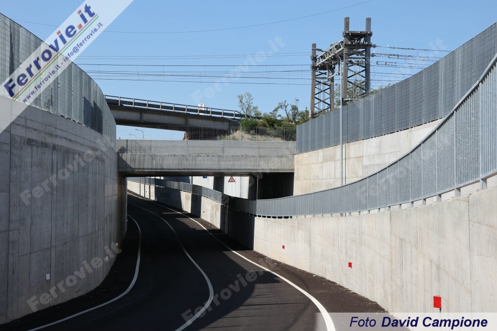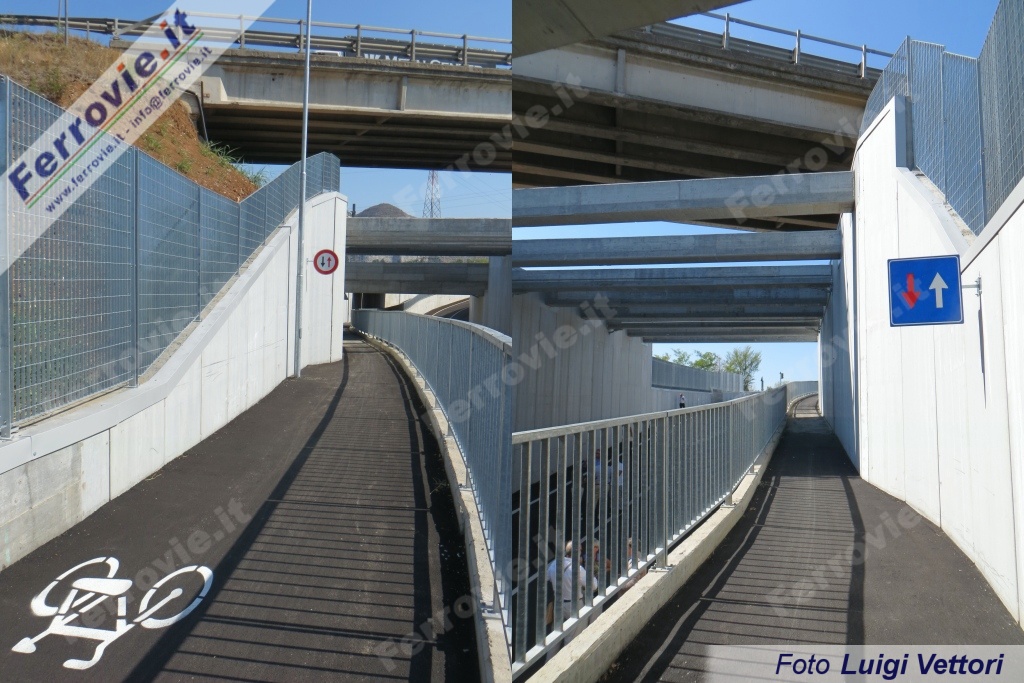 4. La carreggiata carrabile del sottopassaggio e sulla destra in sede propria la pista ciclopedonale. In primo piano la linea ferroviaria e subito dietro la SS45 Bis. (Foto David Campione, 03 agosto 2022)