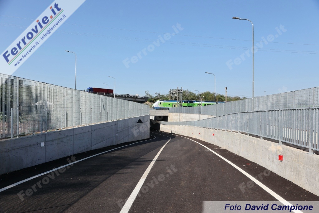 6. La carreggiata del sottopasso vista verso sud. Sullo sfondo un Regio Express di Trenord in corsa verso Brescia e Milano. (Foto David Campione, 03 agosto 2022)