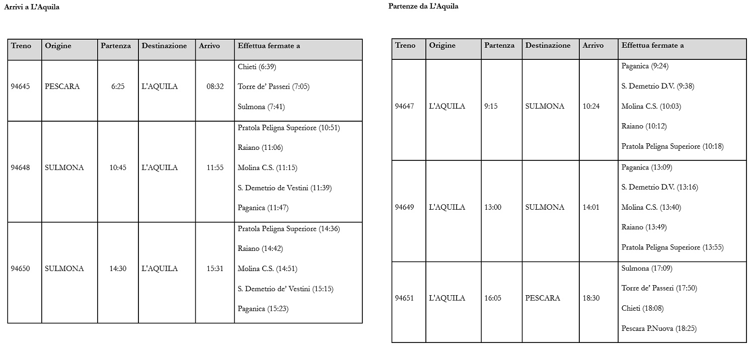 Trenitalia (Gruppo FS Italiane) - di concerto con Regione Abruzzo, committente e programmatrice dei servizi ferroviari - effettuerà 6 treni straordinari in partenza/arrivo alla stazione dell'Aquila.