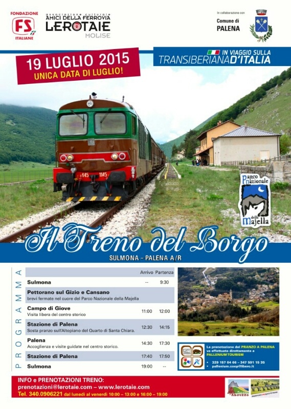 Una vera e propria "metropolitana di montagna" che condurrà i viaggiatori italiani e stranieri fino al borgo medievale di Palena, Bandiera Arancione dal 2006, per le visite guidate alle bellezze artistiche e naturalistiche, con rientro finale in treno storico a Sulmona alle ore 19:00.