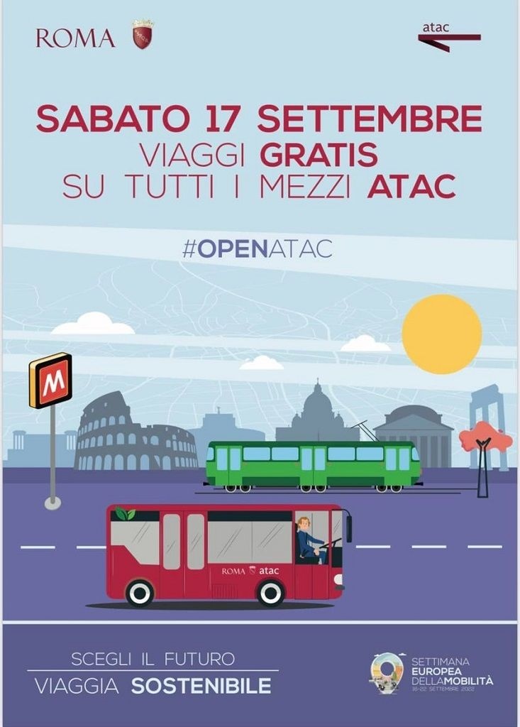 La Giunta di Roma Capitale ha approvato una delibera che dispone per sabato 17 settembre, subito dopo l'apertura della Settimana Europea della Mobilità, la gratuità del trasporto pubblico su tutti i mezzi Atac, in metropolitana e superficie, in tutta la città.
