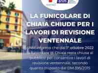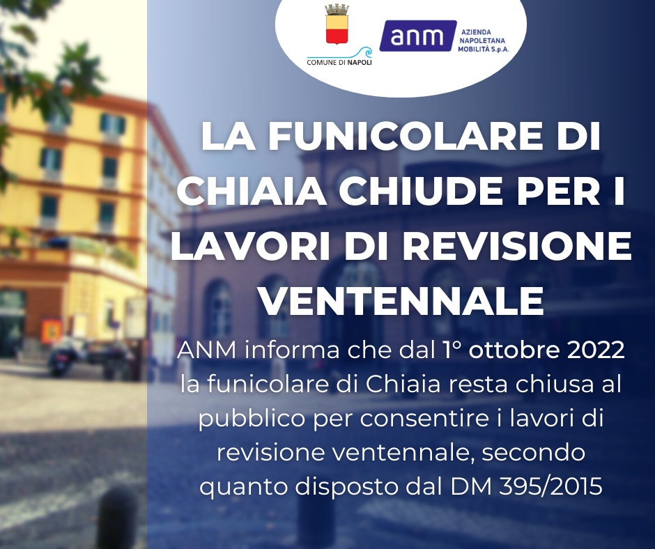 ANM informa che dal 1° ottobre 2022 la funicolare di Chiaia resta chiusa al pubblico per consentire i lavori di revisione ventennale, secondo quanto disposto dal DM 395/2015.