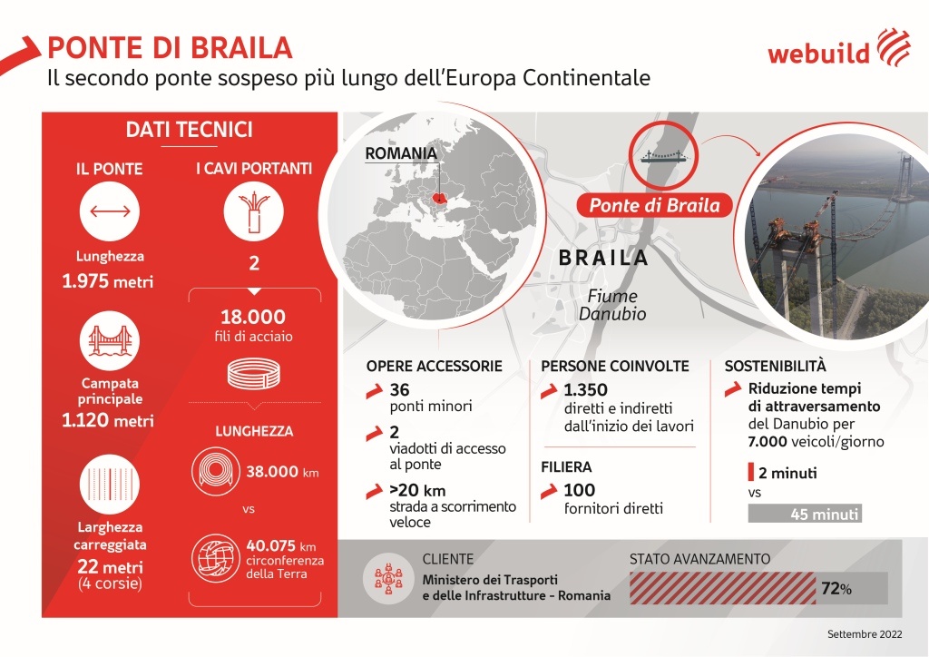 Sarà pronto entro l'anno, in anticipo rispetto al cronoprogramma, il Ponte di Braila in Romania, secondo ponte sospeso più lungo dell'Europa Continentale, realizzato da Webuild in una joint venture internazionale. Prevista anche a breve la consegna di 9 chilometri di strade funzionali al ponte.