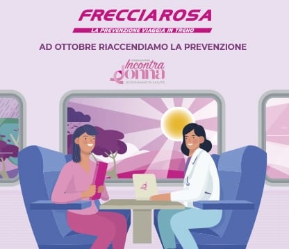 Anche quest'anno, dal 3 al 31 ottobre, appuntamento con Frecciarosa, il progetto di prevenzione del tumore al seno promosso dalla Fondazione IncontraDonna con il Gruppo FS Italiane e il patrocinio del Ministero della Salute che prevede per tutto il mese visite, consulenze ed ecografie gratuite a bordo dei treni ad Alta Velocità, Intercity e Regionali e nei FrecciaLounge di Roma Termini e Milano Centrale.