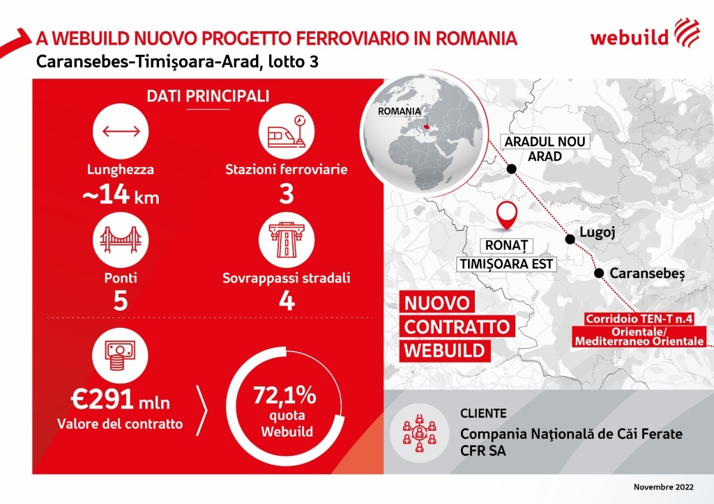 Webuild, in consorzio, si è aggiudicato il contratto da 291 milioni di euro di valore complessivo per l'ammodernamento e il raddoppio del Lotto 3 di una delle più importanti linee ferroviarie in Romania, la Caransebes - Timişoara - Arad, che, una volta ultimata, potenzierà i collegamenti della capitale Bucarest, con la parte occidentale del Paese e con il resto d'Europa. Il progetto è infatti parte del Corridoio Reno - Danubio della TEN-T, la rete transeuropea dei trasporti che punta ad accrescere la mobilità sostenibile per merci e persone nell'Unione Europea.