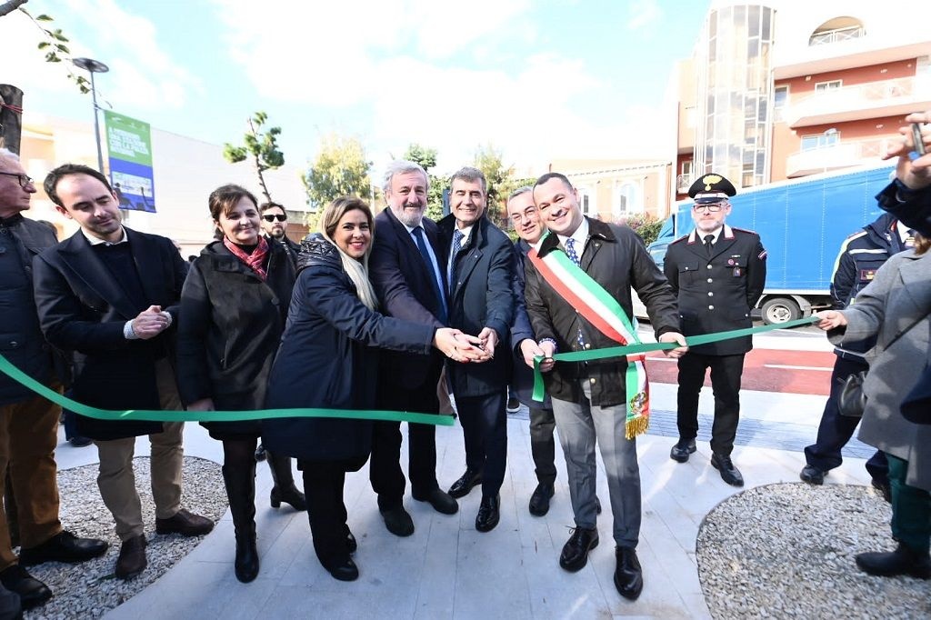 Ottomila metri quadri, parcheggi per auto e bici, 1,8 chilometri di piste ciclabili, un playground, un'area gioco per bambini e una di sgambamento per cani. Sono le caratteristiche della nuova piazza realizzata da Ferrovie Appulo Lucane nell'area circostante la stazione interrata di Modugno, al termine di un grande intervento di riqualificazione proposto da FAL e Assessorato ai Trasporti della Regione Puglia e condiviso dal Comune di Modugno e inaugurata questa mattina (21 dicembre) con una vera e propria festa che ha visto la partecipazione di circa 80 alunni di scuole elementari dei 3 circoli didattici di Modugno, artisti di strada, una banda (la Vagaband), alla presenza del Presidente della Regione Puglia, Michele Emiliano, dell'Assessore regionale ai Trasporti, Anita Maurodinoia, del Sindaco di Modugno, Nicola Bonasia, del Presidente e del Direttore Generale di FAL, Rosario Almiento e Matteo Colamussi.