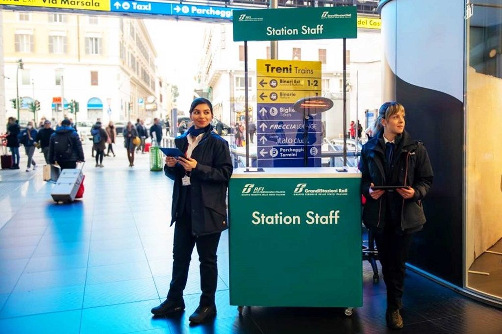 A Roma Termini il team operativo è formato da 15 persone dislocate in punti strategici della stazione e riconoscibili attraverso un gilet e dei desk dedicati. Il servizio sarà svolto 7 giorni su 7, dalle ore 7.00 alle 22.00. Questa nuova figura professionale si occuperà di fornire adeguato supporto alle persone, rispondendo alle loro esigenze di orientamento e accessibilità ai servizi presenti, interfacciandosi con il personale preposto al monitoraggio della qualità e dell'efficienza delle infrastrutture fisiche e digitali dello scalo nonché della sicurezza, con l'obiettivo di accelerare la risoluzione di eventuali problematiche.