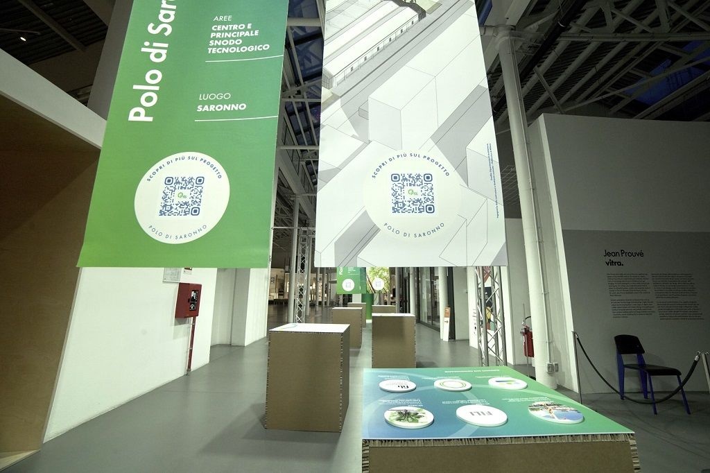 L'allestimento è realizzato interamente con materiali ecologici e riciclabili e si configura come un vero e proprio percorso, un sistema di travi e colonne nude che rappresenta le connessioni strutturali ed evoca la tratta Milano Cadorna - Malpensa. Le travi accompagnano il visitatore alla scoperta del progetto, le colonne diventano metafora di forza e consistenza raccontandone i promotori.
