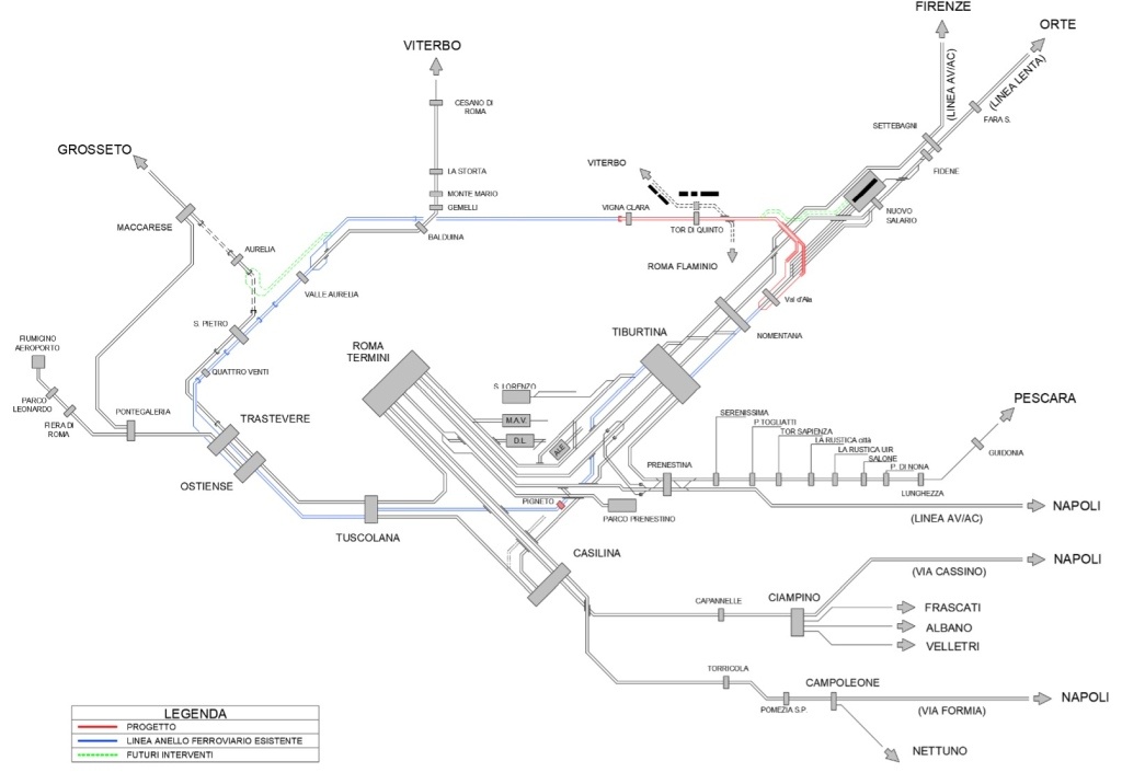 Sono interessati due lotti: la tratta Vigna Clara - Tor di Quinto (Lotto 1B) e la tratta Tor di Quinto - Val d'Ala con modifiche al PRG di Tiburtina (Lotto 2). Il tracciato complessivo dei Lotti 1B e 2 si sviluppa tra la stazione di Vigna Clara, prosegue per Tor di Quinto e, oltrepassato il Tevere, si innesta in direzione est sulla linea merci in corrispondenza di Val d'Ala.