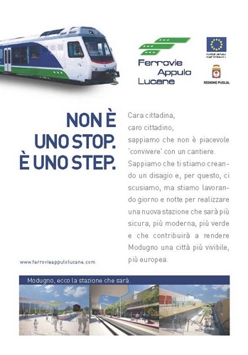 "Ci fermiamo per andare avanti. Dal 10 al 22 agosto prossimi i treni Fal da Bari Centrale a Palo del Colle si fermano per avviare i lavori di raddoppio della linea ferroviaria Bari - Matera. Comodi, si prosegue in autobus da Bari Centrale, Bari Scalo, Bari Policlinico, Modugno e Palo del Colle". Recita così lo slogan scelto da FAL per questa campagna informativa mirata a diffondere il più possibile agli utenti non solo la notizia della parziale e temporanea chiusura della linea, ma anche e soprattutto gli orari (e le stazioni di partenza) dei servizi sostitutivi che, sulla tratta chiusa, vengono garantiti in autobus.