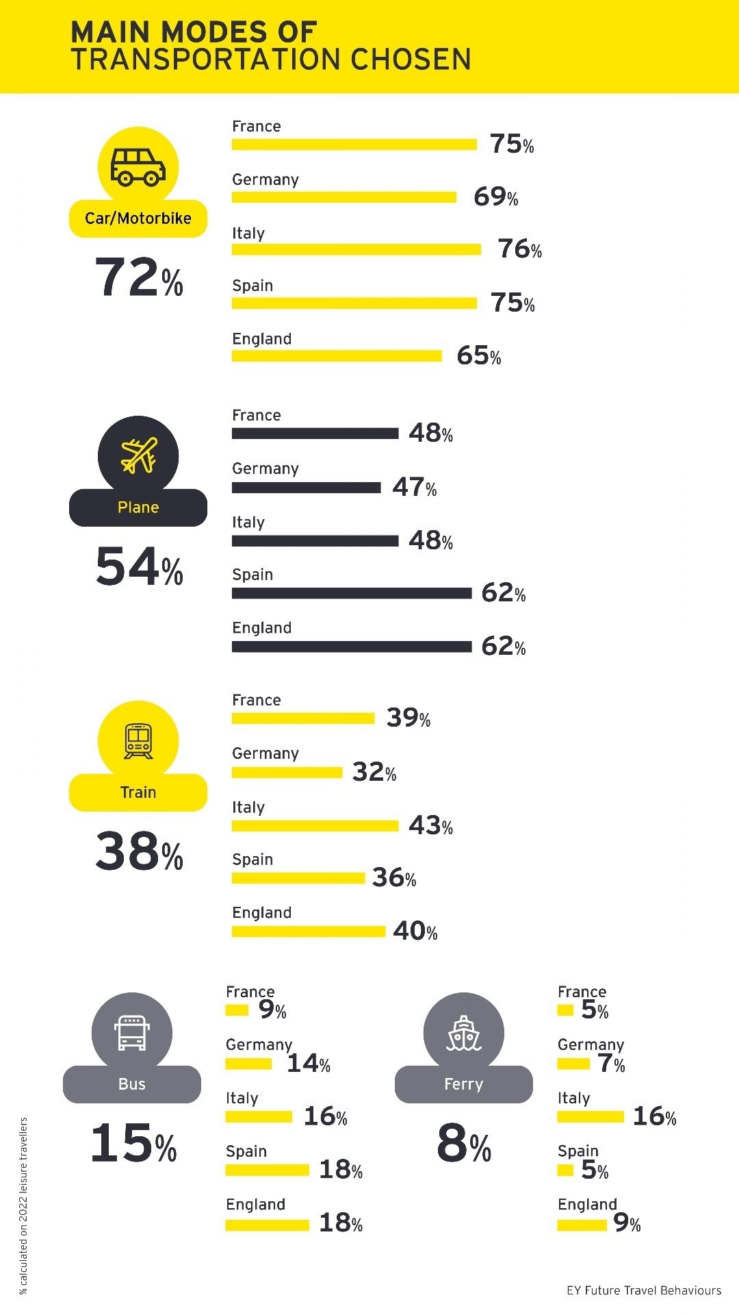 Per quanto riguarda i mezzi di trasporto, si evidenzia nell'Osservatorio come l'aereo abbia un tasso di utilizzo più alto nel Regno Unito e in Spagna mentre l'Italia è al primo posto per l'uso del treno.
